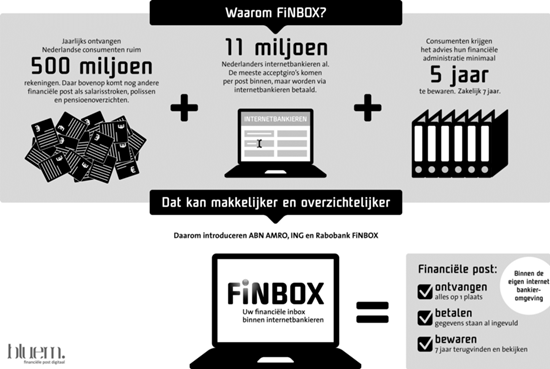 FiNBOX was een initiatief van ABN AMRO, ING en Rabobank. In FiNBOX konden rekeningen binnenkomen maar ook salarisstroken, pensioenoverzichten en polisbladen. Naast het ontvangen van financiƫle post had FiNBOX een bewaar- en een betaalfunctie. Je rekeningen bleven na betalen 7 jaar beschikbaar bijvoorbeeld.